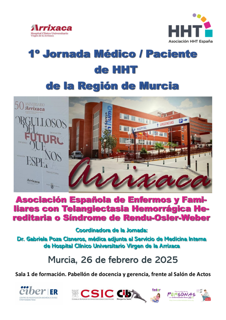 Dentro del marco de las actividades relacionadas con el Día Mundial de las enfermedades raras que se celebra en el mes de febrero, nuestra asociación se suma celebrando una jornada médico/paciente de afectados de Telangiectasia Hemorrágica Hereditaria en el Hospital Universitario Virgen de la Arrixaca de Murcia.