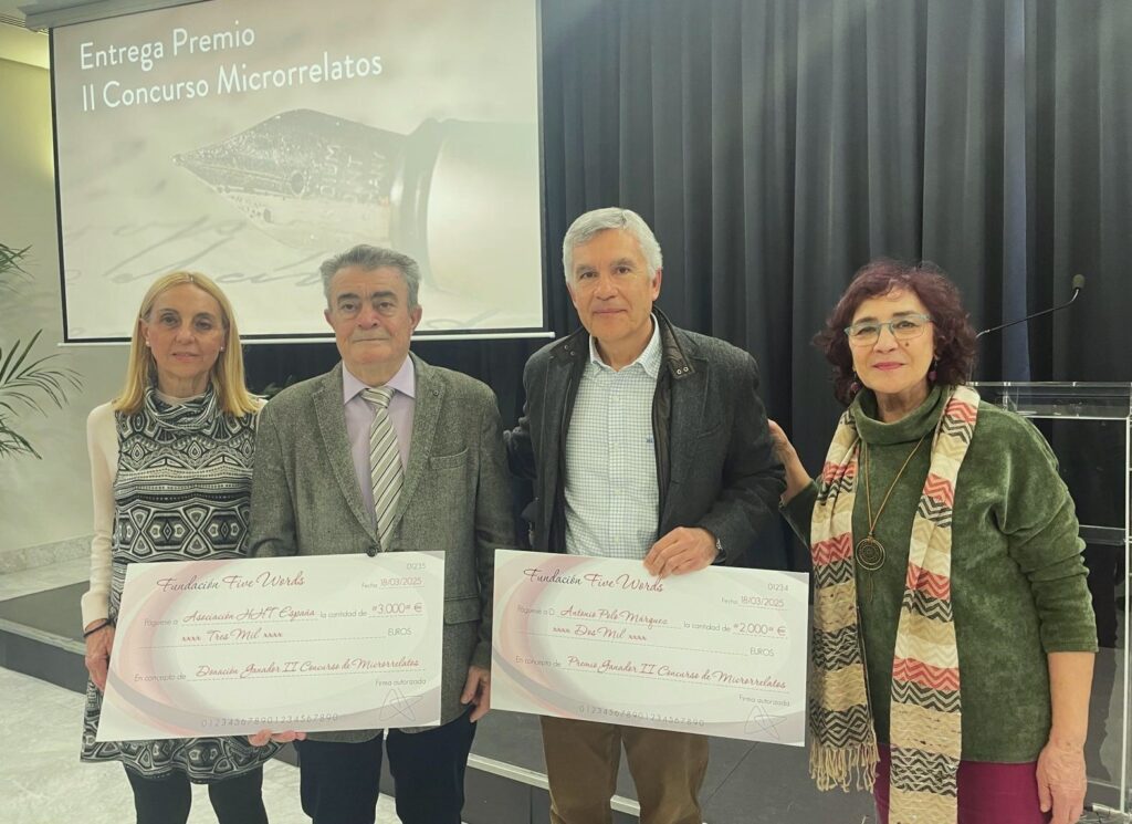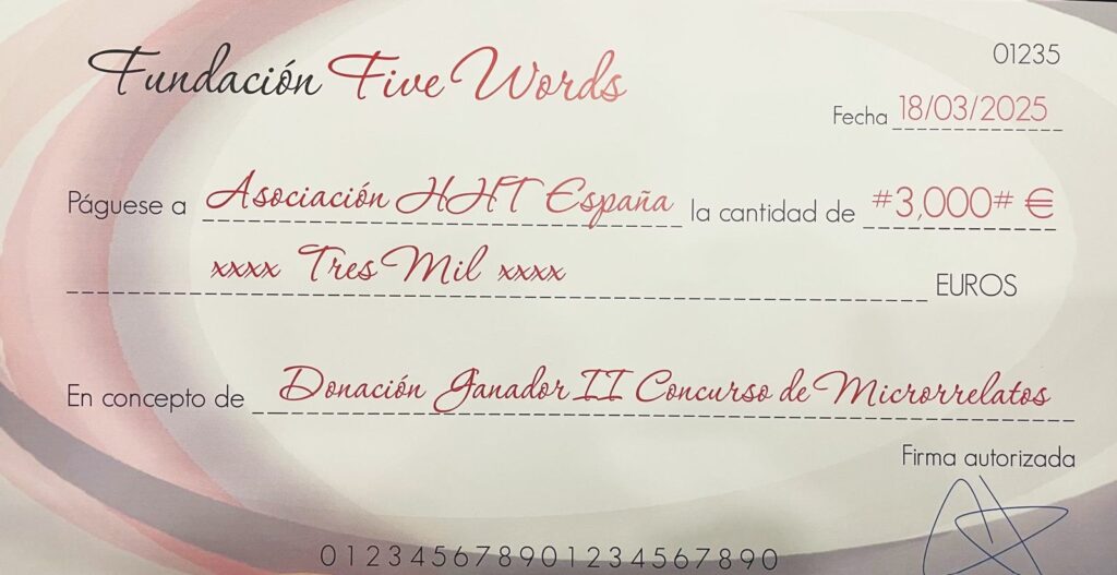 Gracias a la colaboración entre nuestra asociación y la Fundación Five Words en la que fuimos su “Causa del Mes de Mayo” ahora hemos sido elegidos por el ganador del II Concurso de Microrrelatos para recibir un donativo de 3.000 euros.