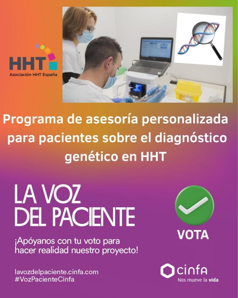 Nuestra Asociación HHT España presenta el “Programa de asesoría personalizada para pacientes de diagnóstico genético para HHT”. Ayúdanos a hacer realidad nuestro proyecto consiguiendo la ayuda de Laboratorios CINFA. VOTA POR NUESTRO PROYECTO